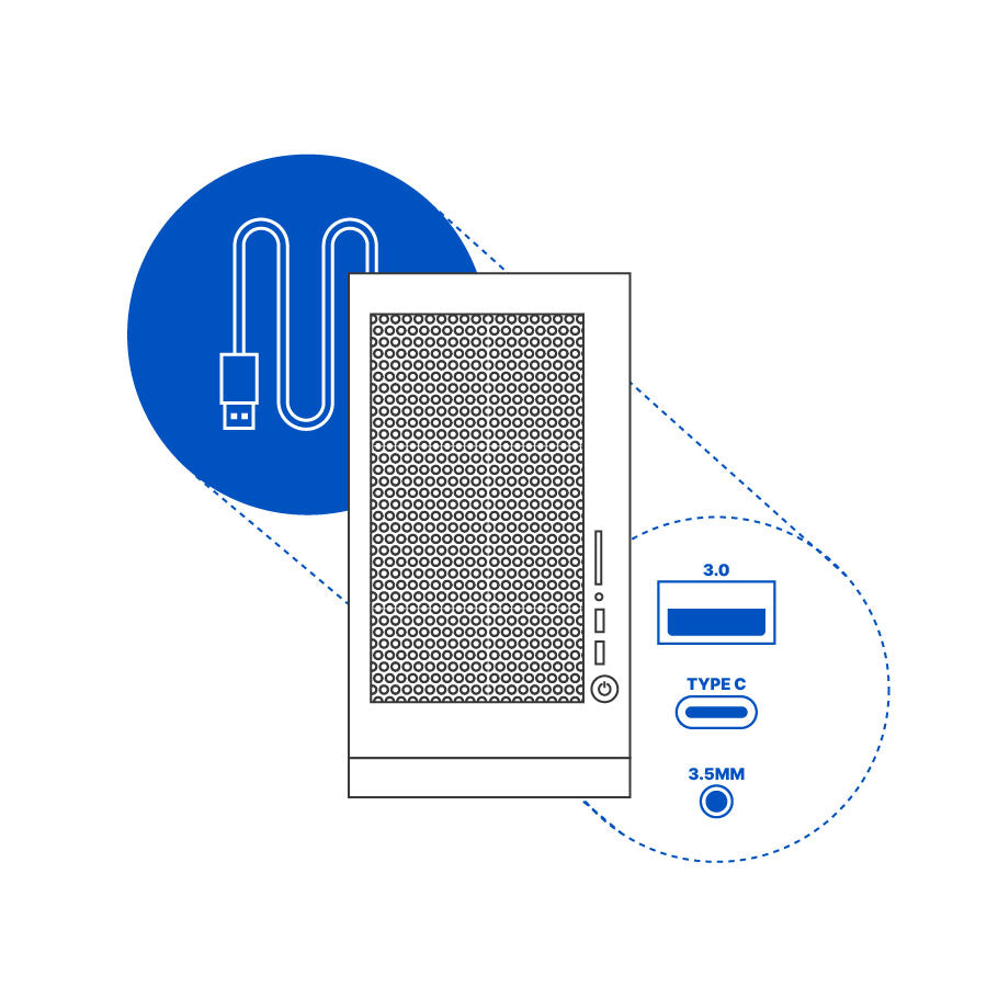 The compact MATX case has USB ports, Audio and Mic I/O ports on the front panel for convenient access. Perfect for those that own wired peripherals and use external storage drives.